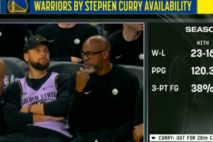 勇士主場迎戰(zhàn)馬刺,鏡頭給到庫里時,轉(zhuǎn)播方給出了本賽季有無庫里勇士戰(zhàn)績對比。