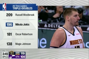 此役,約基奇輕松寫意拿下生涯第196個三雙,繼續追逐威少的209次三雙紀錄。