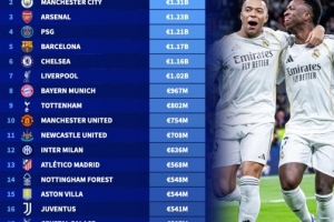 體育資訊4月2日訊 德國轉會市場公布了新一期的俱樂部身價情況,皇馬以13.4億歐居首,曼城以13.1億歐次之,阿森納則以12.3億歐位居第三。
