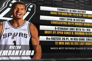 連續5場15+籃板,海軍上將(連續9場)后馬刺隊史首人