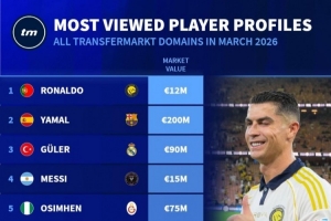 體育資訊4月3日訊 德國轉會市場列出了3月份球員頁面瀏覽量排名,C羅居首,亞馬爾、居萊爾、梅西前四。