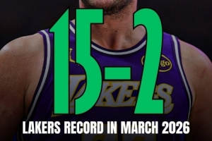 整個三月份(當(dāng)?shù)貢r間),湖人一共打了17場比賽,戰(zhàn)績15勝2負(fù)。