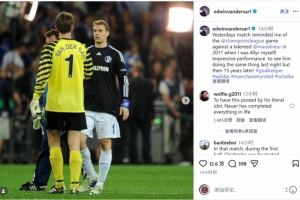傳奇門將范德薩社媒曬出昔日與諾伊爾交手的合照,配文:“昨天的比賽讓我想起了2011年在歐冠賽場對陣才華橫溢的諾伊爾,當時我自己也40歲了!昨晚看到他奉獻與當年同樣出色的表現,但時間已經過去了15年,真是令人印象深刻!”
