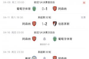 歐冠1/4決賽,阿森納客場(chǎng)1-0戰(zhàn)勝葡萄牙體育;英超方面首回合交手,阿森納1-1戰(zhàn)平曼城!