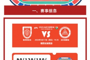 4月17日周五19:35,中超第6輪,重慶銅梁龍主場對陣深圳新鵬城的比賽在銅梁龍體育場進(jìn)行,俱樂部官方發(fā)布本場票務(wù)信息,票價分為90元、120元、150元、200元以及300元5檔,開售時間為4月14日19點。