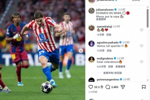 阿爾瓦雷斯社媒曬出比賽照片,慶祝球隊晉級,配文:“我們晉級歐冠半決賽,現在要沖擊國王杯冠軍!”
