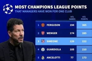 執教單一俱樂部歐冠拿分榜:(淘汰賽勝利計為3分)