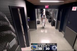 首節還剩2分多鐘時,勇士球星斯蒂芬·庫里走回更衣室,沒有隊醫陪同。