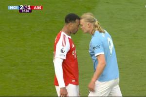體育資訊04月20日訊 本輪英超焦點戰曼城2-1戰勝阿森納,比賽第83分鐘,哈蘭德和加布里埃爾頂牛導致兩隊球員之間爆發了沖突,二人各吃一張黃牌。