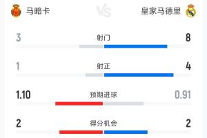 體育資訊04月04日訊 西甲第30輪馬略卡vs皇馬上半場戰罷,馬略卡暫時1-0領先,以下為雙方半場數據對比: