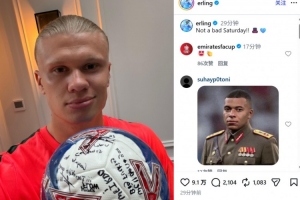哈蘭德也在賽后通過社媒曬出了隊友們簽名的足球,并調侃道:“周六過得還不錯????”