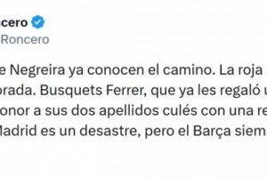 《阿斯報(bào)》主編、皇馬球迷龍賽羅社媒寫(xiě)道:“內(nèi)格雷拉的繼承者們已經(jīng)摸清了門(mén)道。這是本賽季至今最明顯的紅牌。布斯克茨·費(fèi)雷爾——這位已經(jīng)在巴列卡斯送給過(guò)他們一個(gè)點(diǎn)球的裁判——用一次可恥的改判,完美地印證了他的兩個(gè)帶有巴薩色彩的姓氏,皇馬表現(xiàn)確實(shí)糟糕,但巴薩永遠(yuǎn)是12人作戰(zhàn)。”