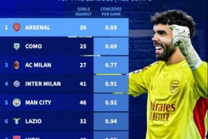 德轉盤點了本賽季五大聯賽球隊在各項賽事場均丟球最少榜單,阿森納與科莫并列最少,具體如下(總丟球+場均丟球):