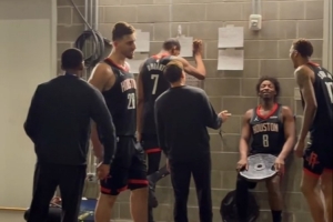 賽后,騰訊ESPN記者孟超發博曬出視頻,并寫道:“險勝勇士之后,火箭賽后在更衣室外全體加練?!?/p>