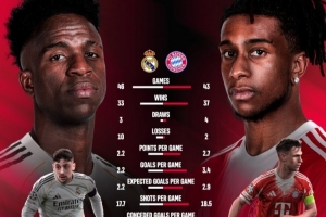 體育資訊4月7日訊 北京時間明天凌晨,拜仁將在歐冠1/4決賽首回合比賽中客場對陣皇馬,拜仁官方更新社媒動態,曬出了兩隊本賽季的數據。