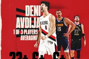本賽季,阿夫迪亞場(chǎng)均23.9分7籃板6.7助攻;約基奇場(chǎng)均27.9分12.9籃板10.9助攻;東契奇場(chǎng)均33.5分7.7籃板8.3助攻。