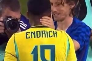 賽后,19歲恩德里克抱起40歲的莫德里奇,莫德里奇和恩德里克擁抱聊了一會。
